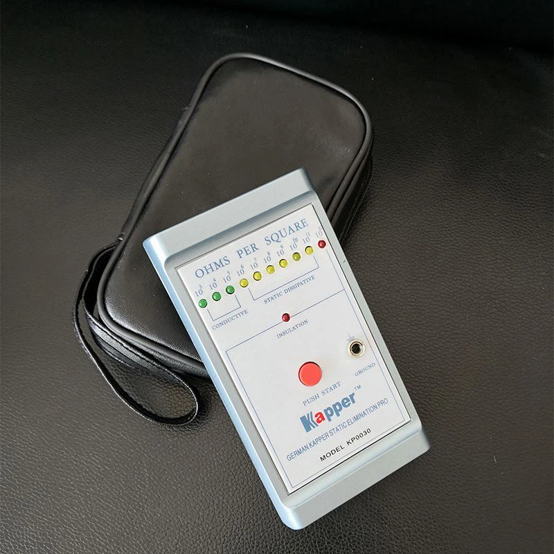 Handheld Surface Resistance Tester txais ASTM tus qauv D-257 kev sim, tsuas yog muab tso rau saum npoo ntawm cov khoom ntsuas thiab nias lub pob liab. Lub ntsuas yuav muaj kaum 10 ΩΩ -10 Ω² Ω los yog rwb thaiv tsev, thiab LED yuav teeb ib qho ntawm cov nqi ntsuas. Thaum kuaj, ob qhov sib npaug ntawm cov electrodes nyob rau hauv qab ntawm lub tester yog siv los soj ntsuam sai sai ntawm qhov chaw conductivity, nto electrostatic dissipation kev ua tau zoo, thiab nto rwb thaiv tsev ntawm cov khoom. (Ceeb Toom: Cov cuab yeej no tsis tuaj yeem ntsuas cov khoom nrog qhov kev tiv thaiv saum npoo tshaj 10 ¹² Ω.)